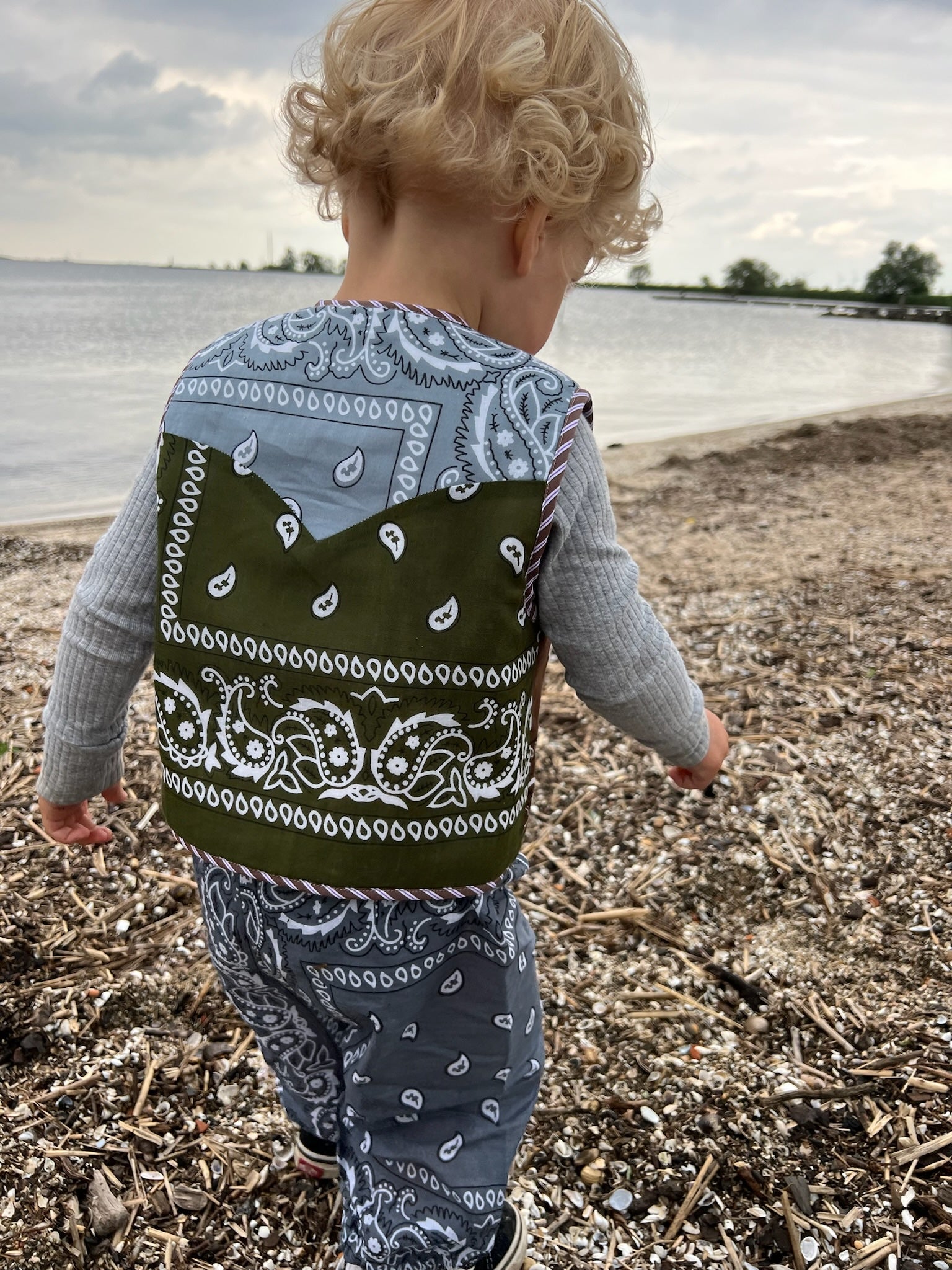 Discover our patchwork reversible Kids' Gilet adorned with the iconic bandana print. Carefully crafted in our Amsterdam atelier, each gilet is designed with little ones in mind, ensuring both comfort and style. The option to reverse adds a playful twist to their wardrobe, allowing for easy mix-and-match.