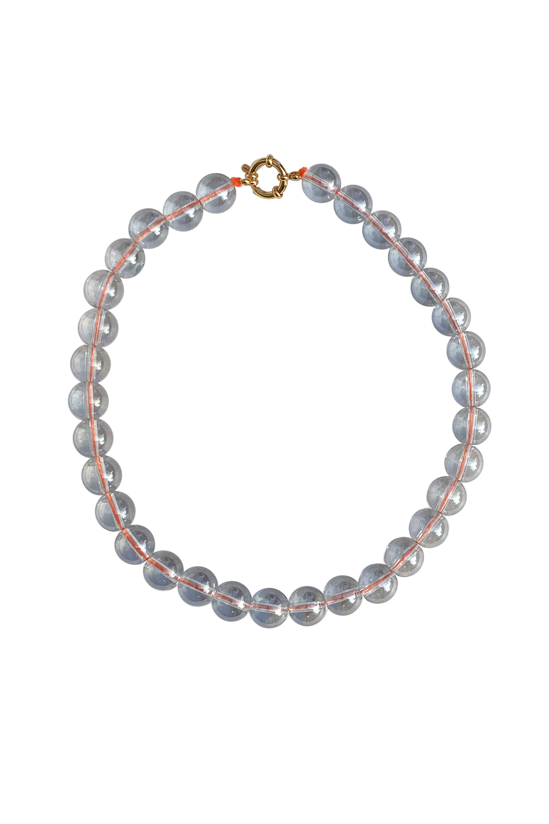 Blue clear glass bead necklace with orange string and gold colored closure.