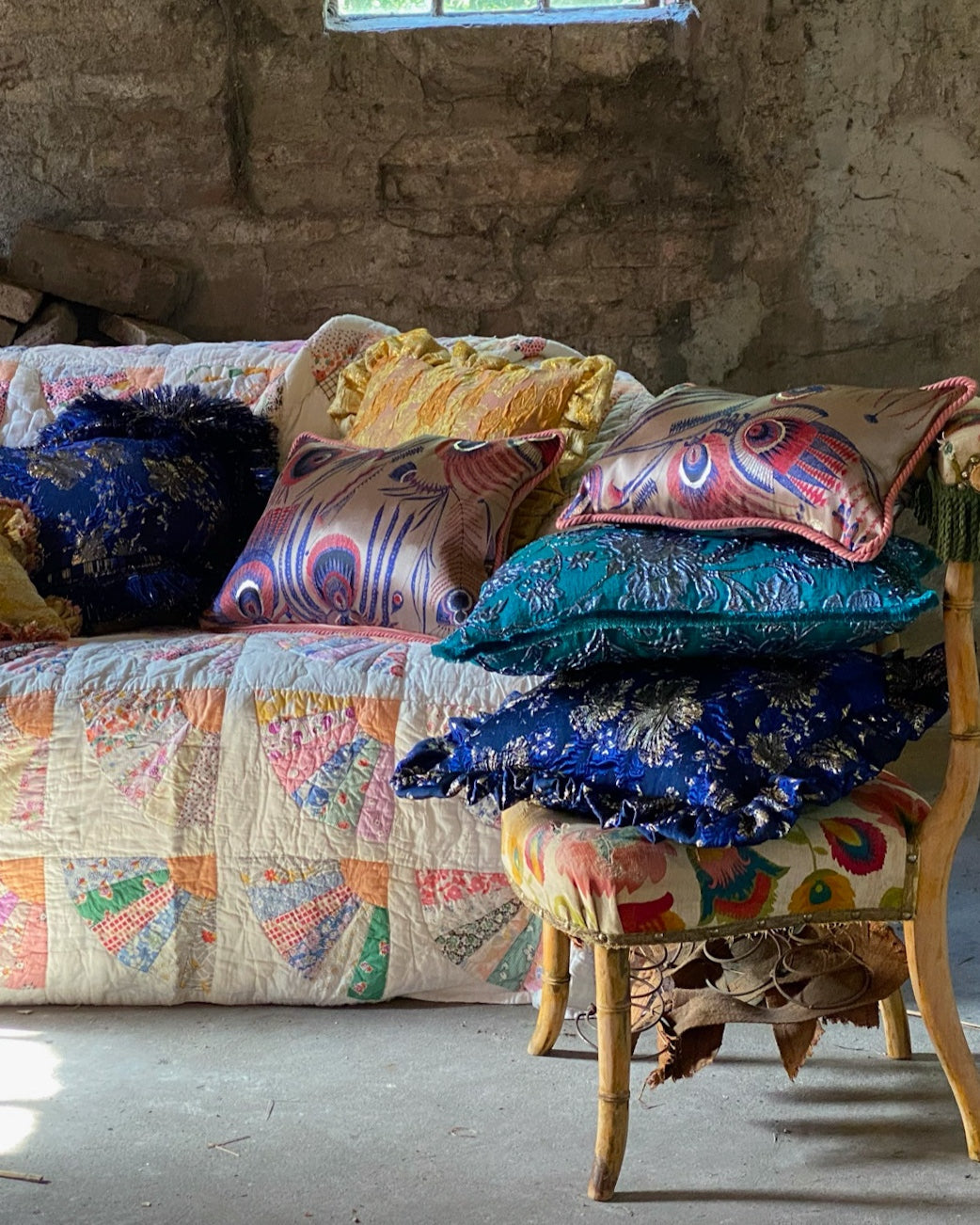 Luxury cushion, finished with fringes around the edges. The designs may vary due to the cut of the fabric.