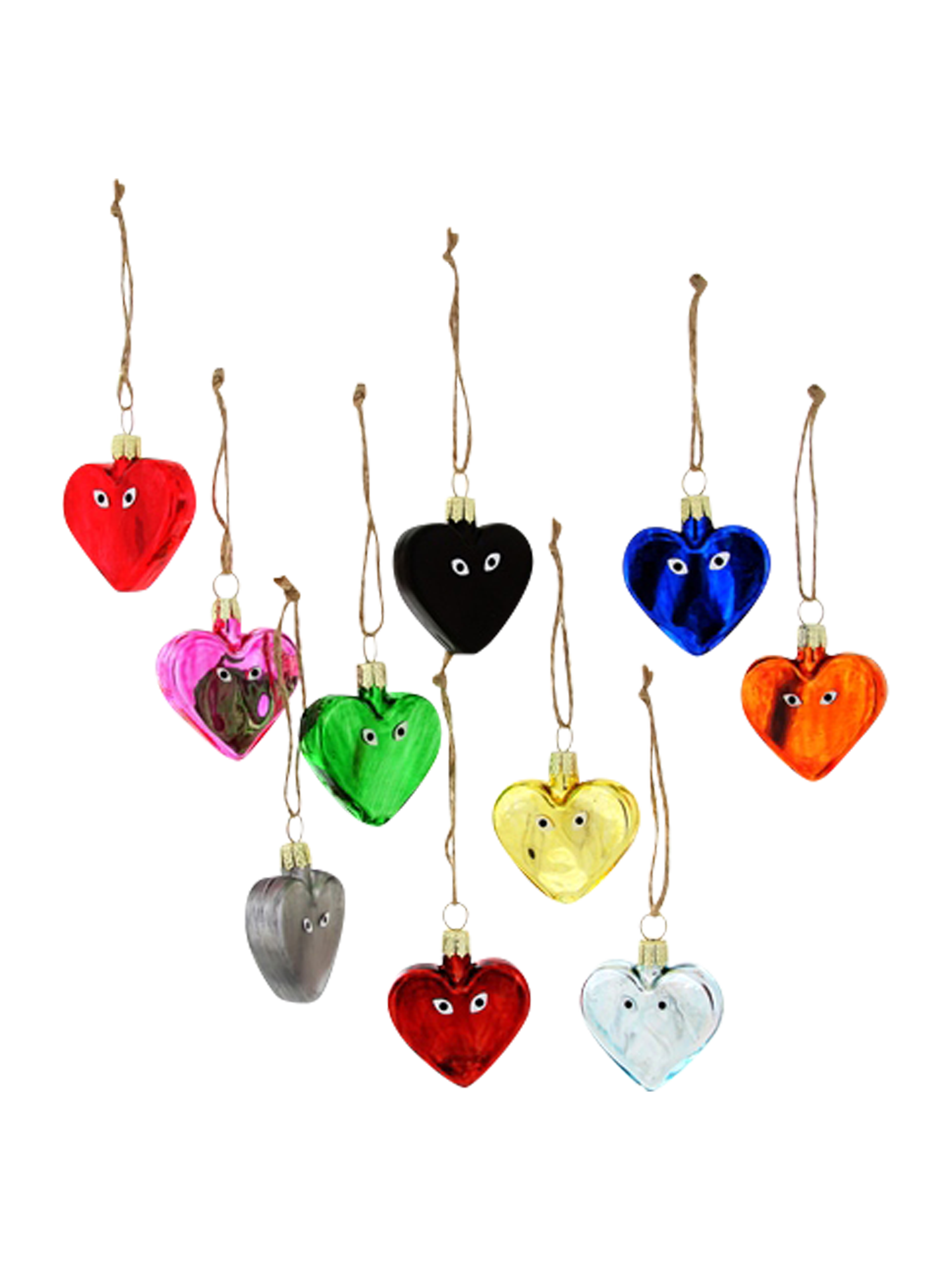 Glass multicolor heart-shaped Christmas tree ornaments with painted eyes.