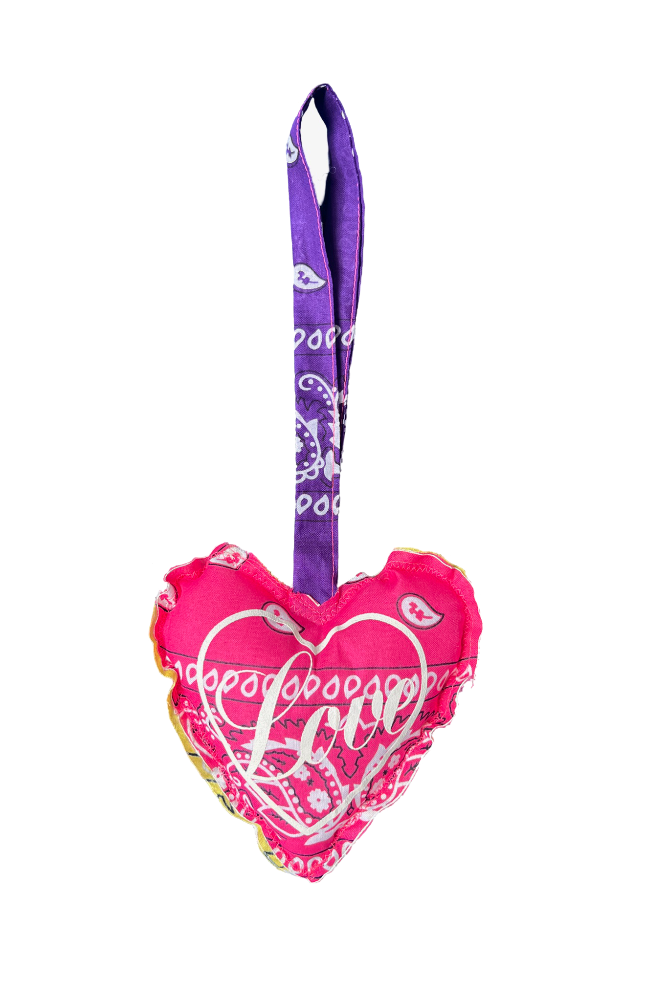 Add some charm to your bag with this unique heart-shaped keychain made from two colorful bandanas.