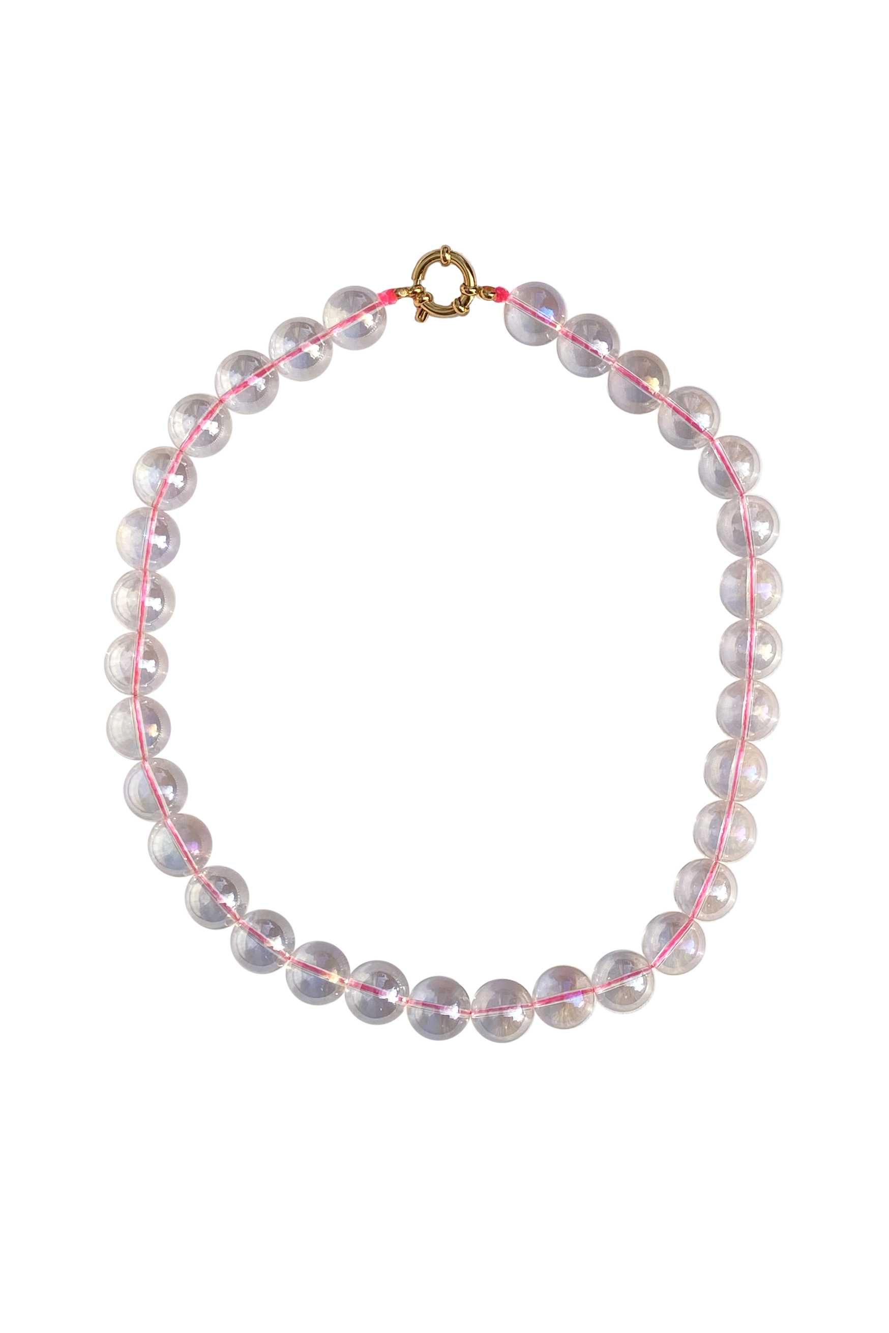 Clear glass bead necklace with hot pink string and gold colored closure.