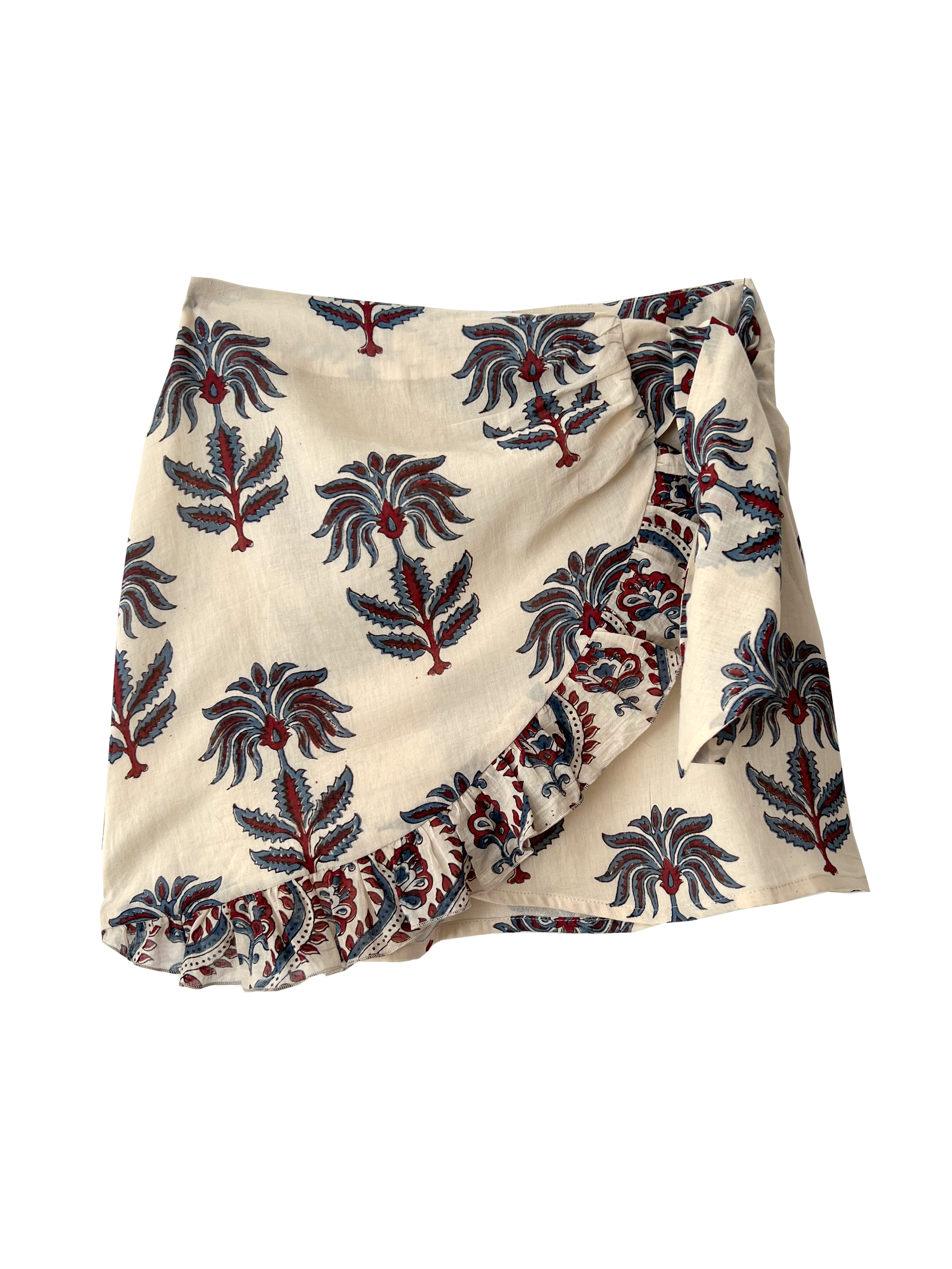 Mini wrap skirt with floral print and side tie fastening.